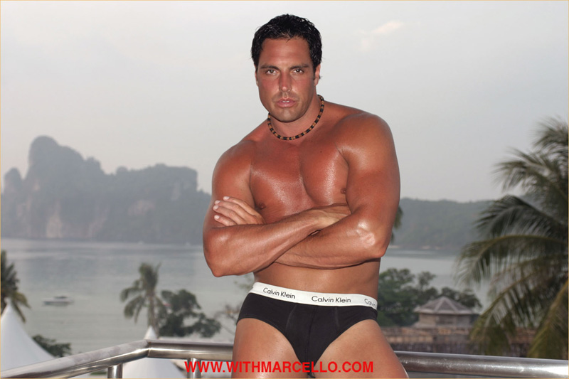 : Marcello oils up on the balcony then releases his spunking cock in the bedroom